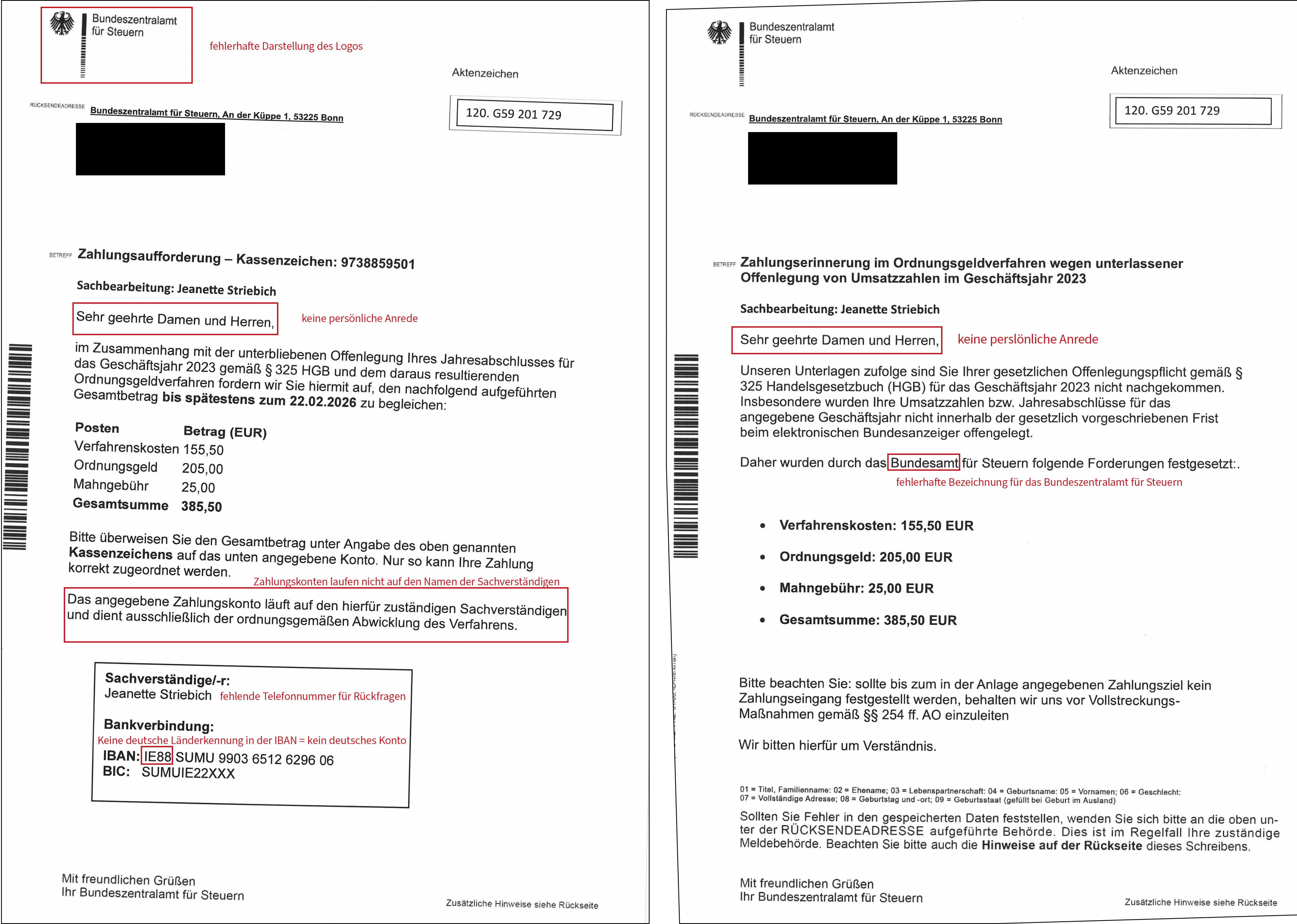 IBAN ohne deutsche Länderkennung: Offizielle Zahlungsaufforderungen deutscher Behörden verwenden ausschließlich Konten mit deutscher IBAN („DE“).